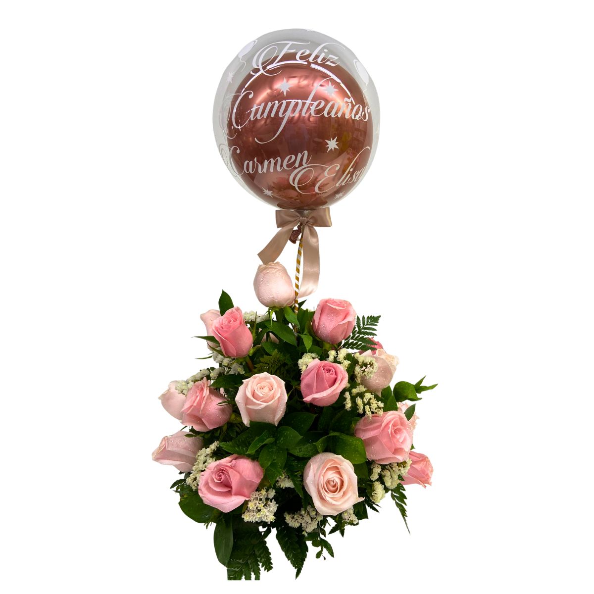 Arreglo floral tipo centro de mesa con rosas y globo burbuja personalizado de 9 pulgadas (Puede tener cambios según disponibilidad)