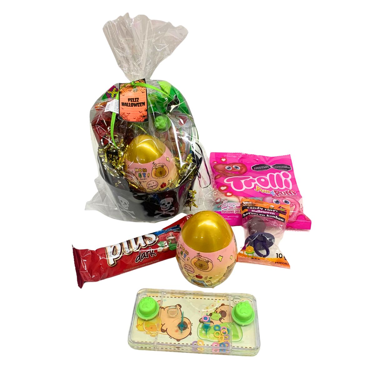 Dulce con huevo sorpresa de capibara, mini atari, chocolate, goma y bombón (Puede variar según la disponibilidad de productos)