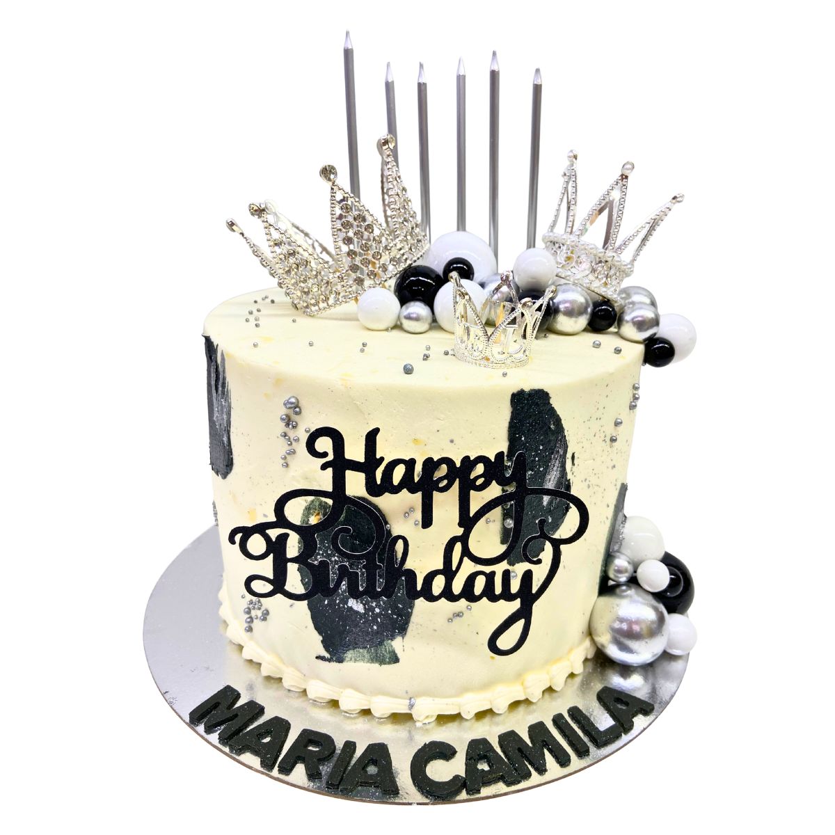Torta sabor naranja con relleno de arequipe, topper, coronas, velas y bolitas decorativas – Equivale a 30 personas