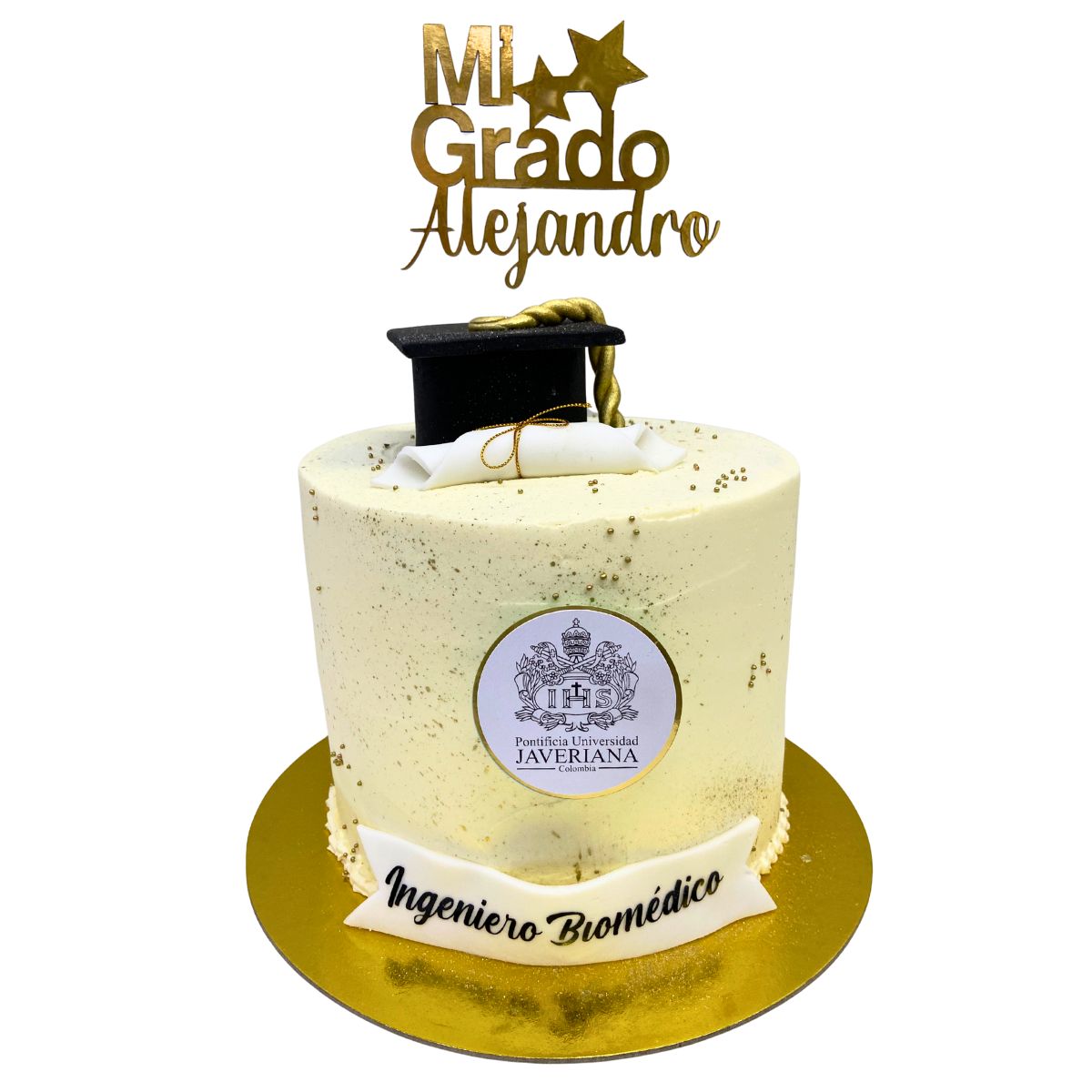 Torta sabor naranja con arequipe, topper personalizado, birrete, diploma, logo y banda personalizada – Equivale a 40 personas